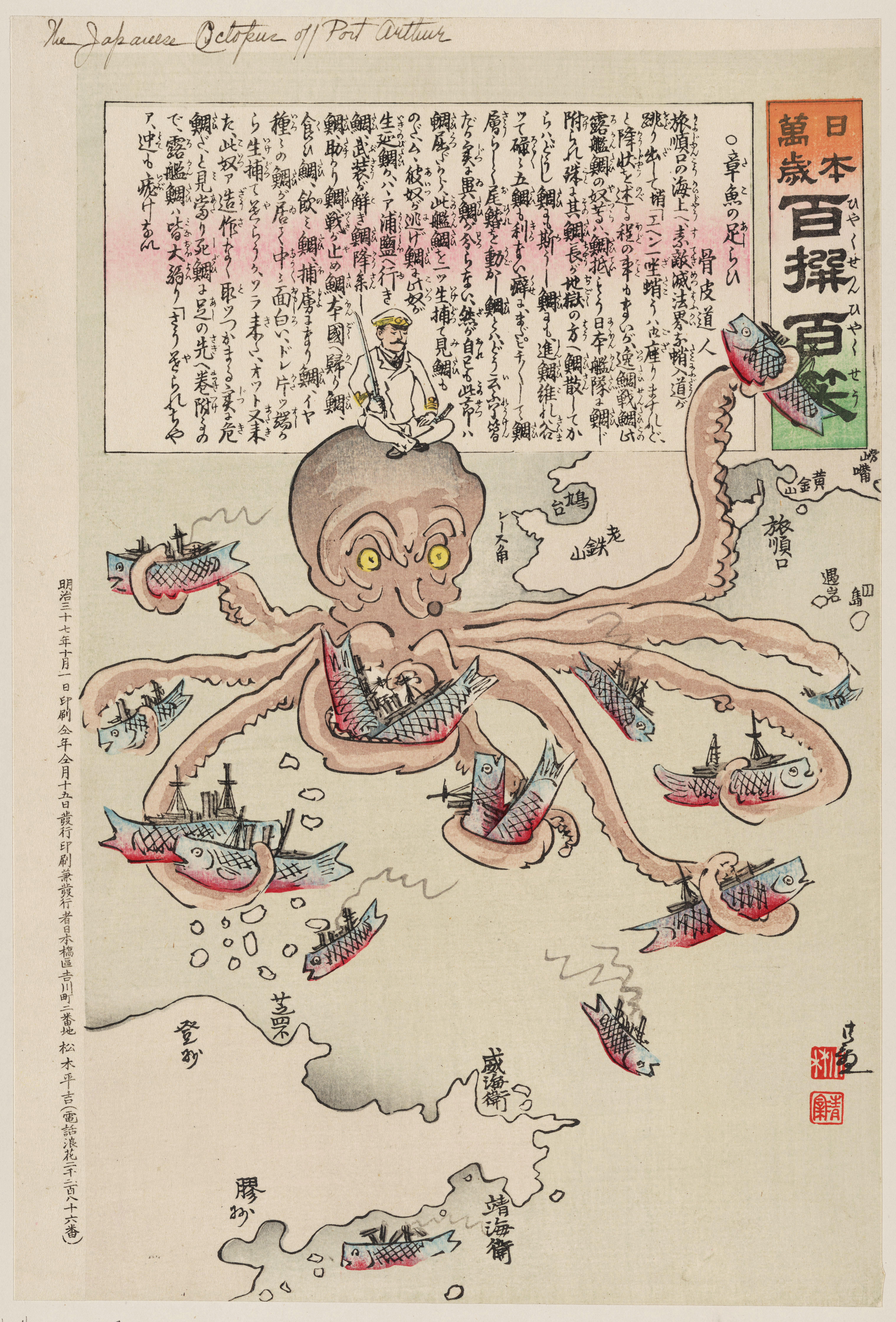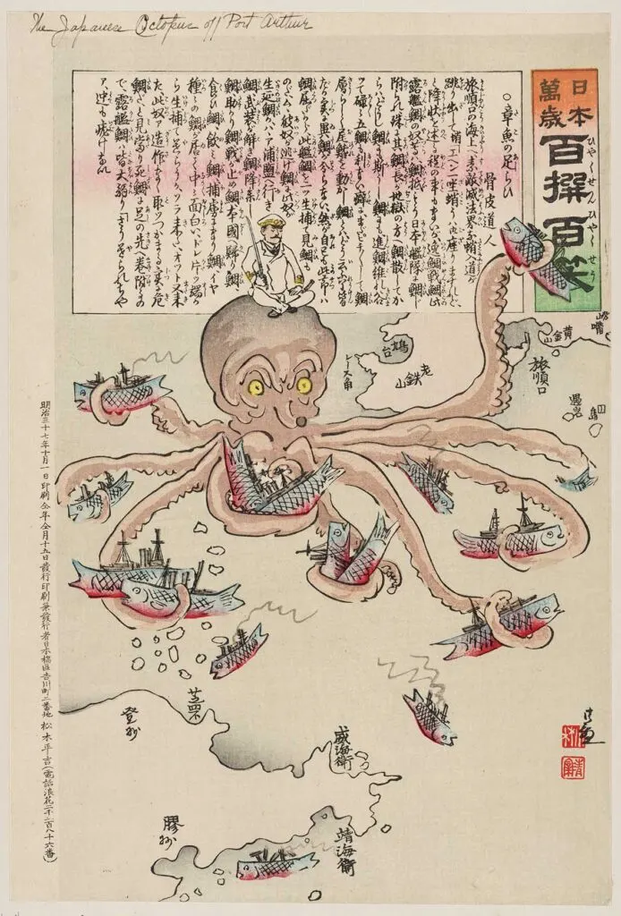 A 1904 print shows a Japanese officer sitting on the head of an octopus which has captured ships disguised as fish in its tentacles. From the collection at the Library of Congress.