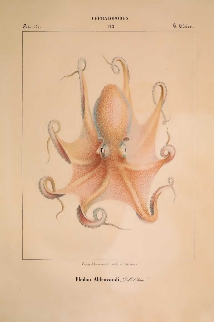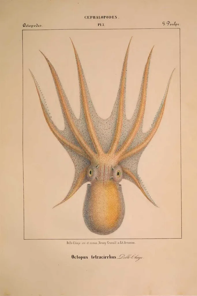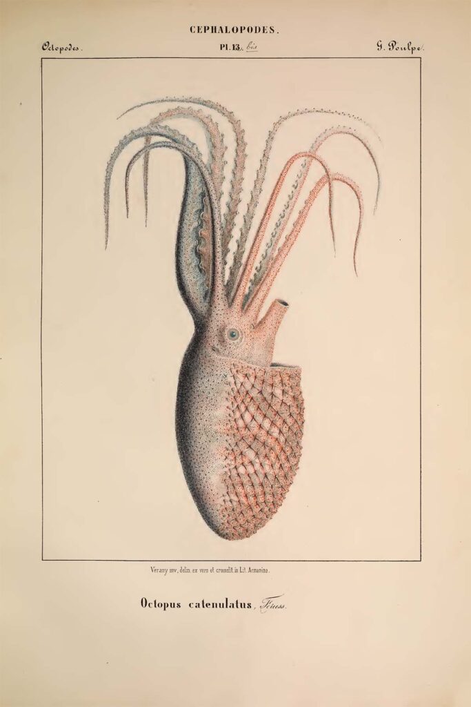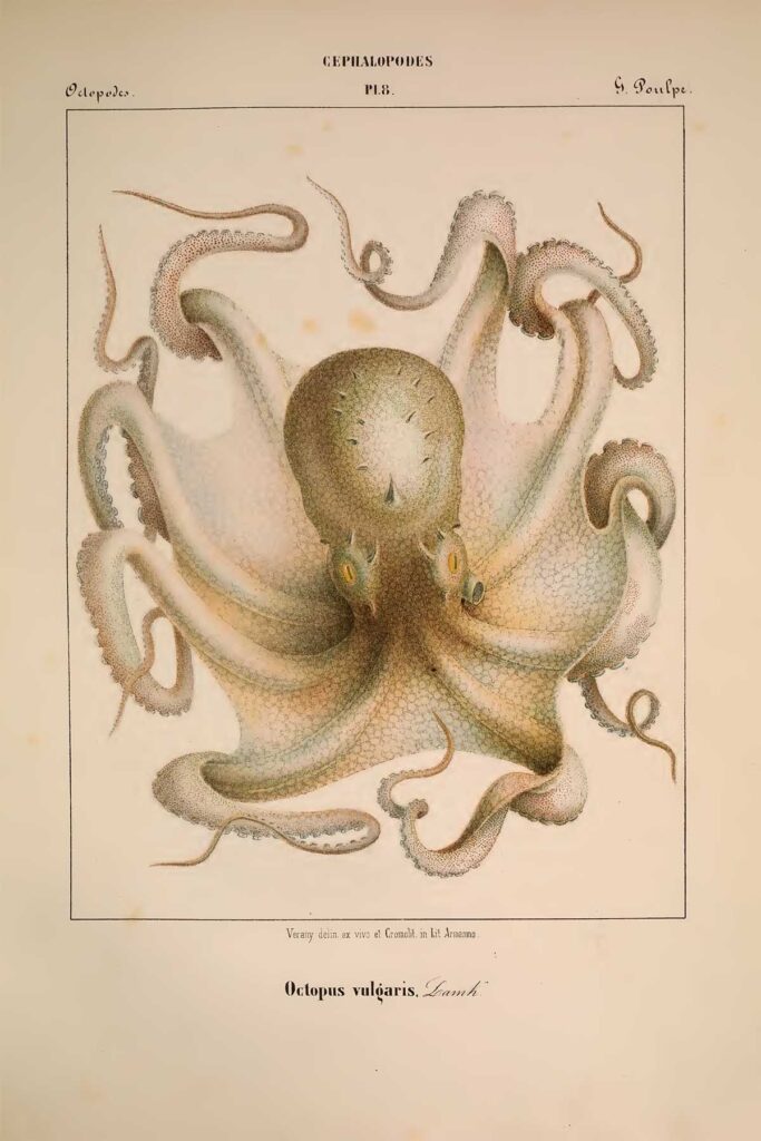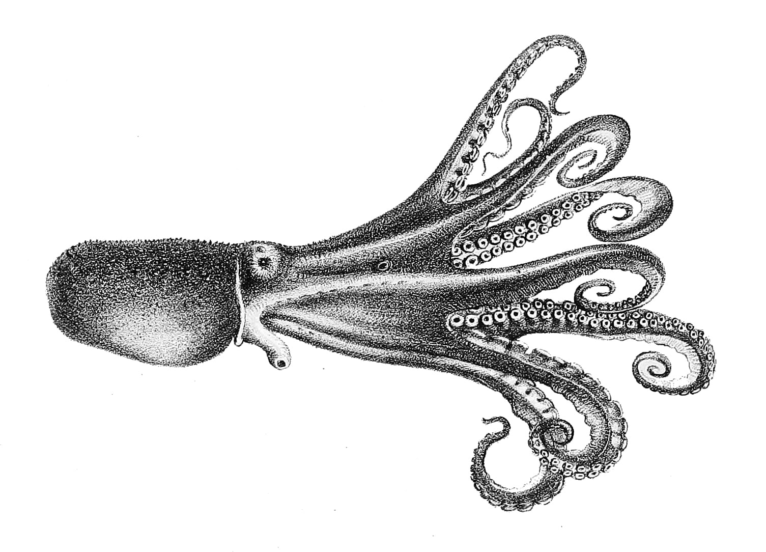 The spider octopus drawing is from the book ” I Cefalopodi viventi nel Golfo di Napoli (sistematica) : monografia “ (Cephalopods living in the Gulf of Naples (systematic): monograph) by Comingio Merculiano published in 1896.