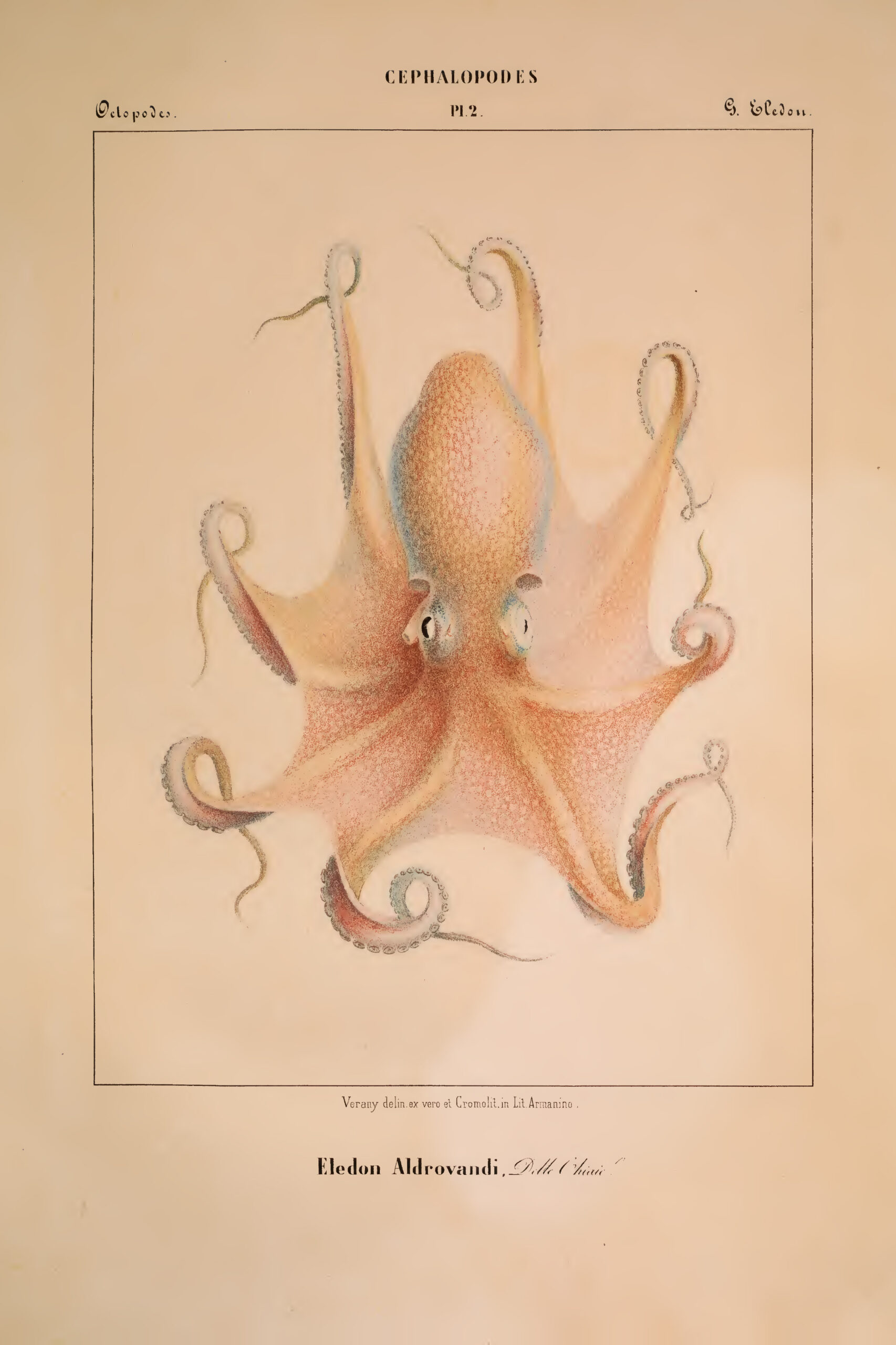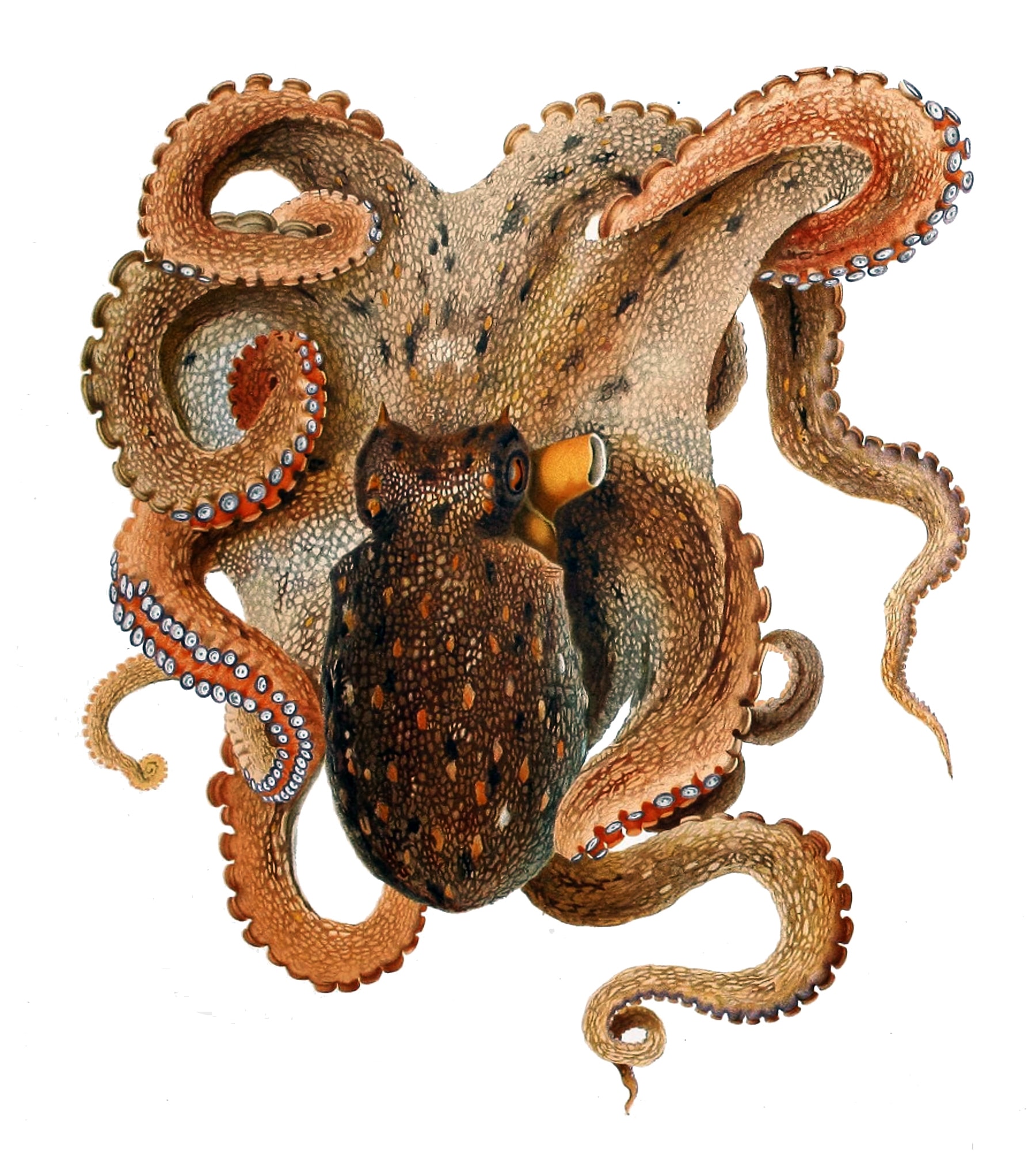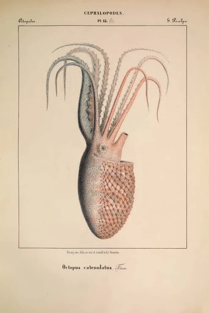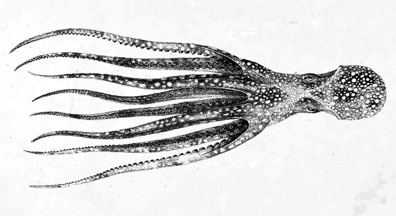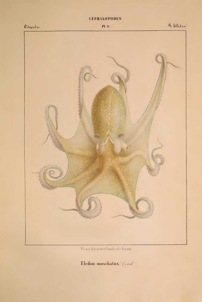 The spider octopus drawing is from the book ” I Cefalopodi viventi nel Golfo di Napoli (sistematica) : monografia “ (Cephalopods living in the Gulf of Naples (systematic): monograph) by Comingio Merculiano published in 1896.