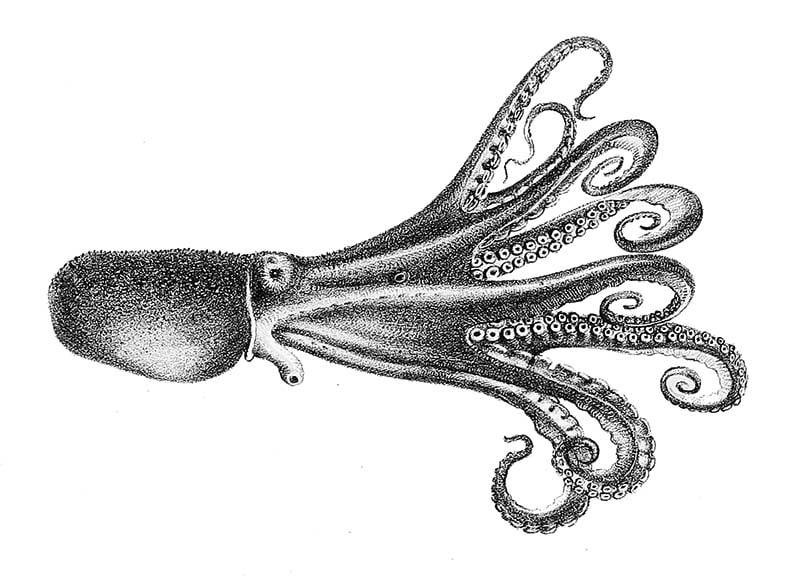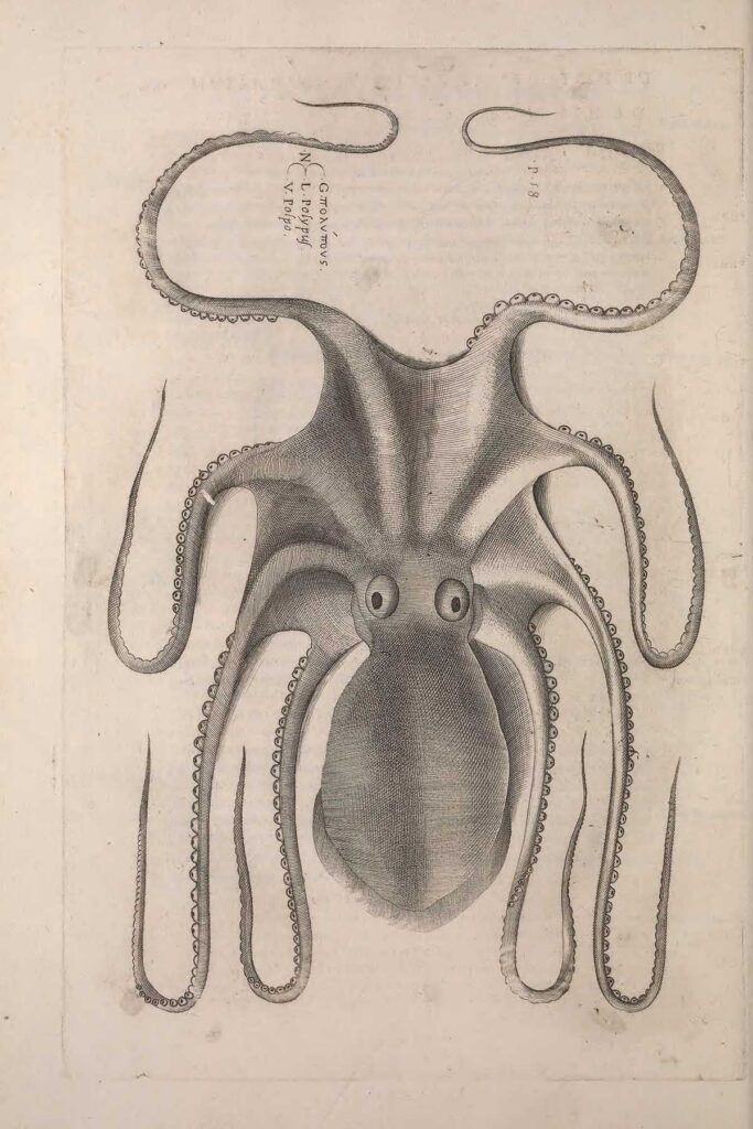 A very old black and white sketch of a vintage octopus from the 1554 book “The History of Aquatic Animals“.
