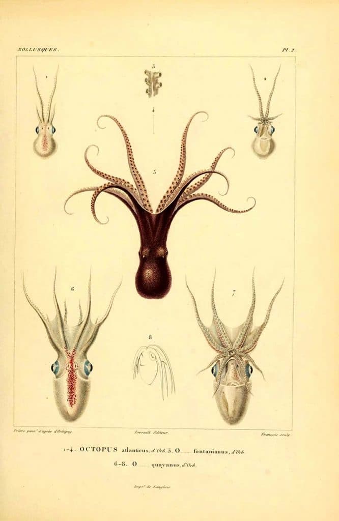 An identification poster of Atlantic octopuses from the book ” Voyage dans l’Amérique méridional” (Travel in South America) by Alcide Dessalines d’Orbigny.