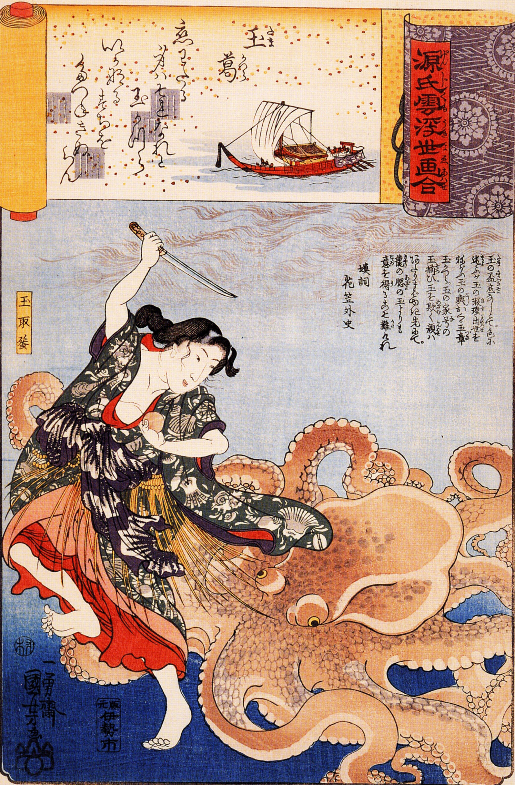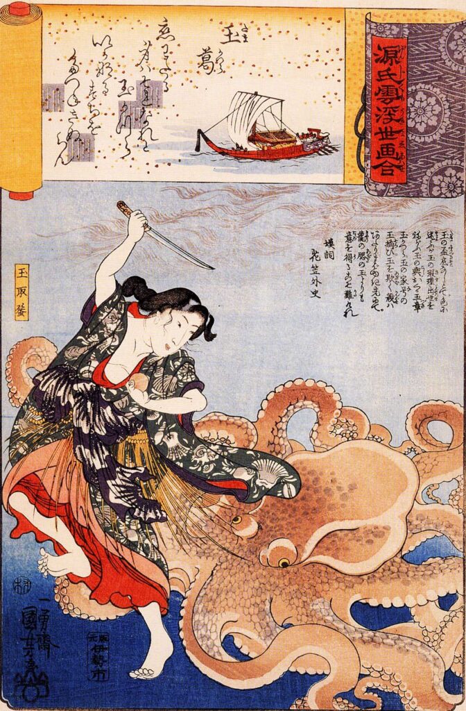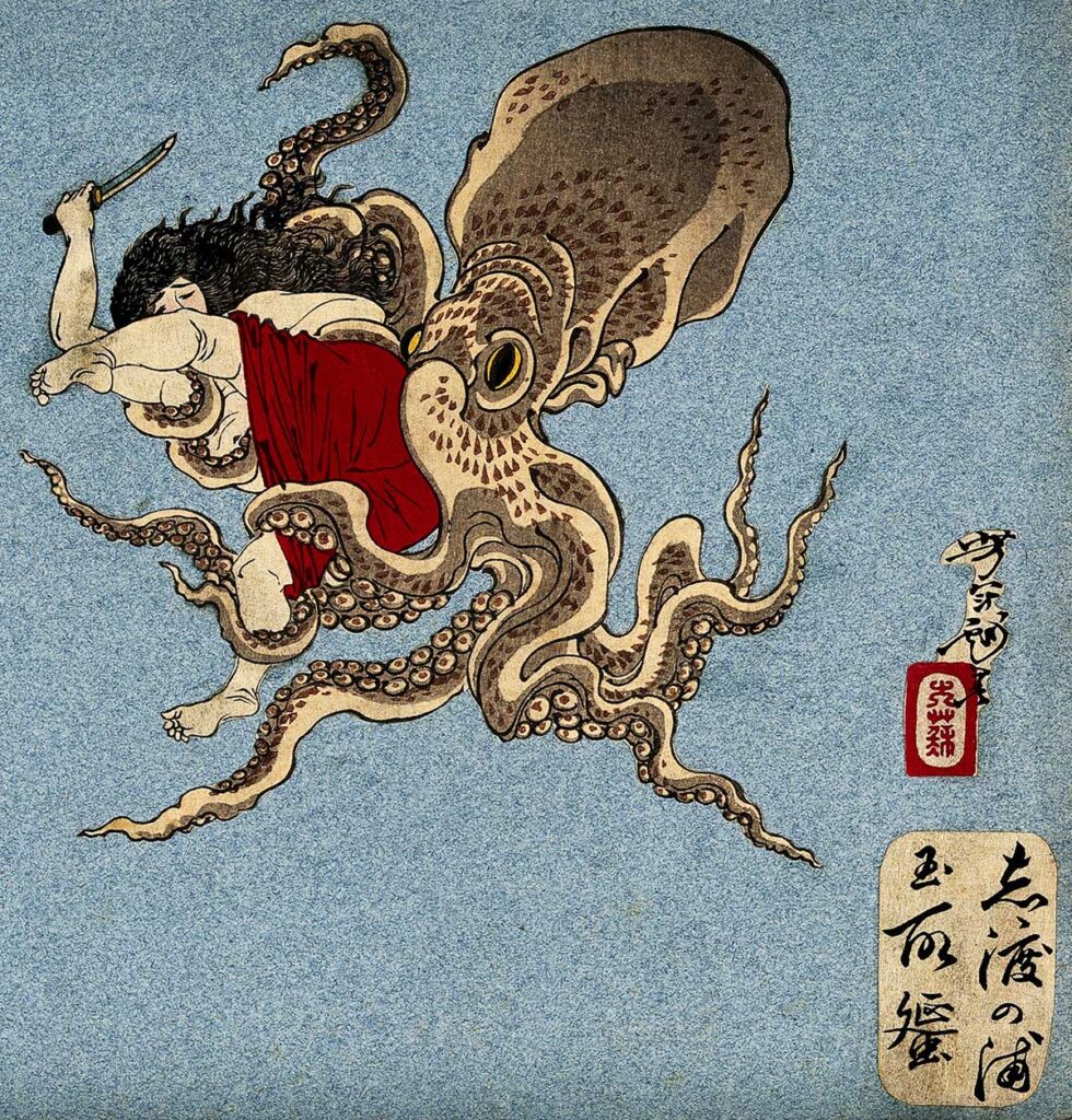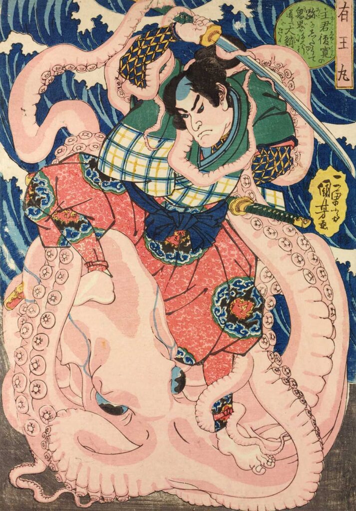 Warrior fighting octopus by Utagawa Kuniyoshi 1830. From the collection at the British Museum.