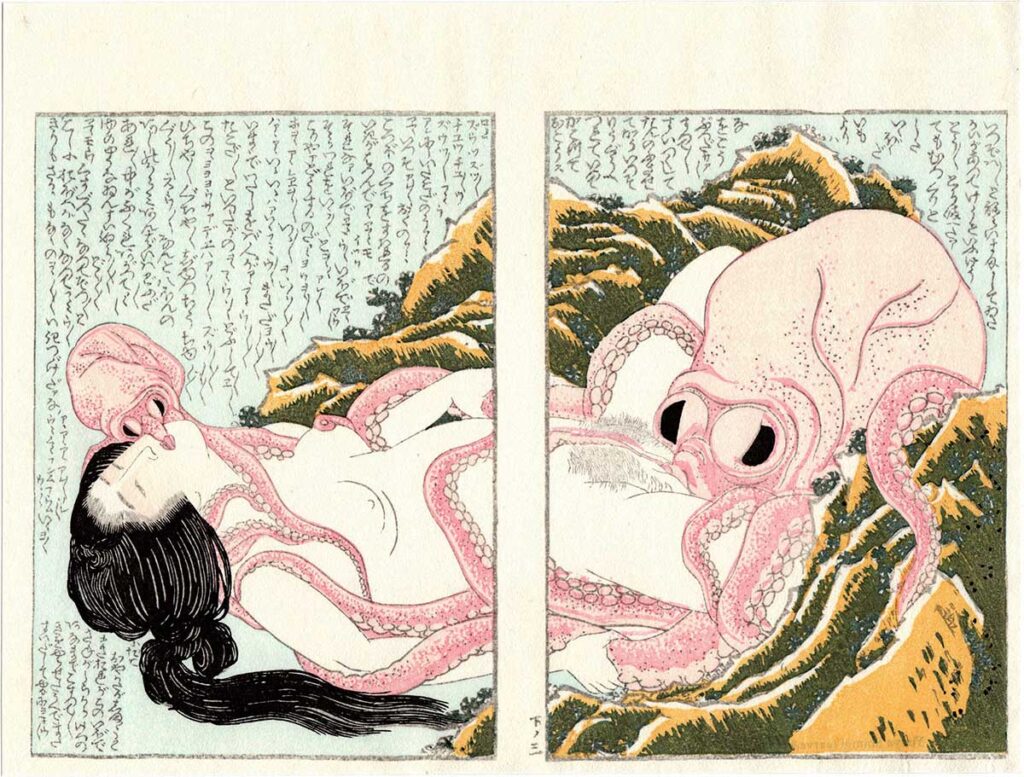 This is a woodblock print by the famous Japanese artist Hokusai, it is famous for depicting a female shell diver in a compromising position with an octopus!