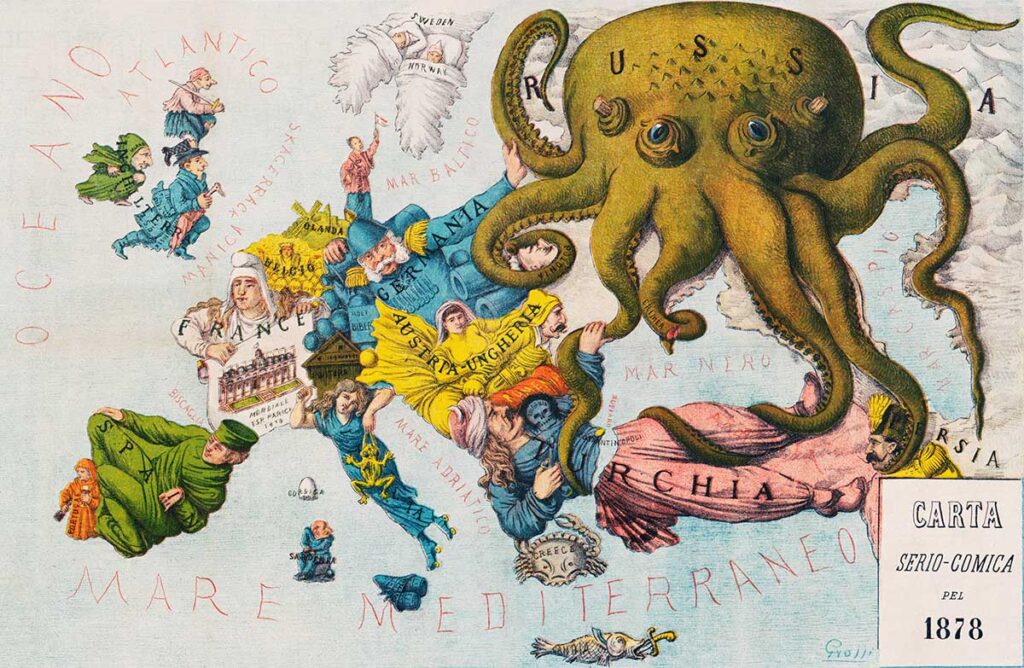 A cartoon depiction of Europe in 1878, using caricatures and monster kraken, from Library of Congress.