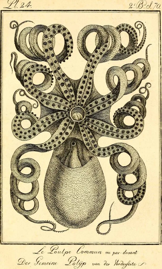 A black and white drawing of the underside of an octopus from the (1803) book “Denys Montforts allgemeine und besondere Naturgeschichte der Weichwürmer – Mollusques, als Fortsetzung der Bussonschen Naturgeschichte”. This translates as Denys Montfort’s general and particular natural history of softworms – Mollusques, as a continuation of Busson’s natural history.