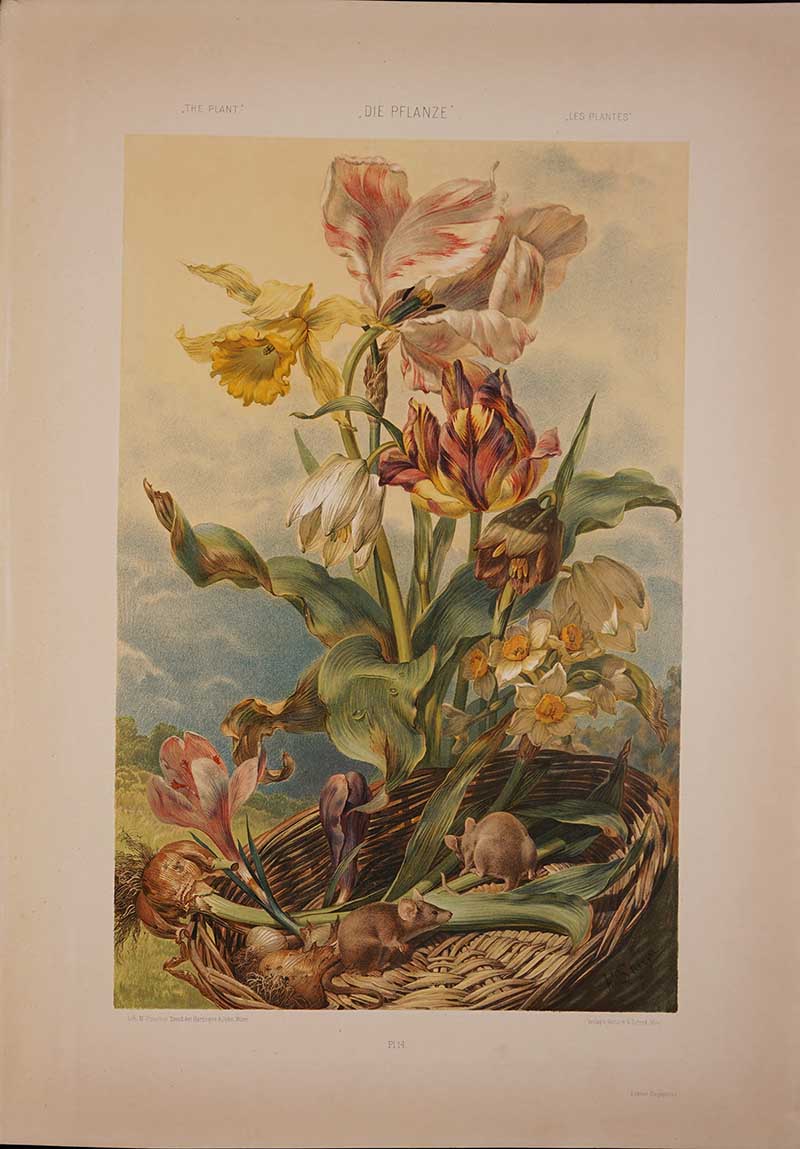 A colour lithograph of the same flowers above in a more artistic style with mice. These flowers remind me of the Dutch Masters still life paintings.