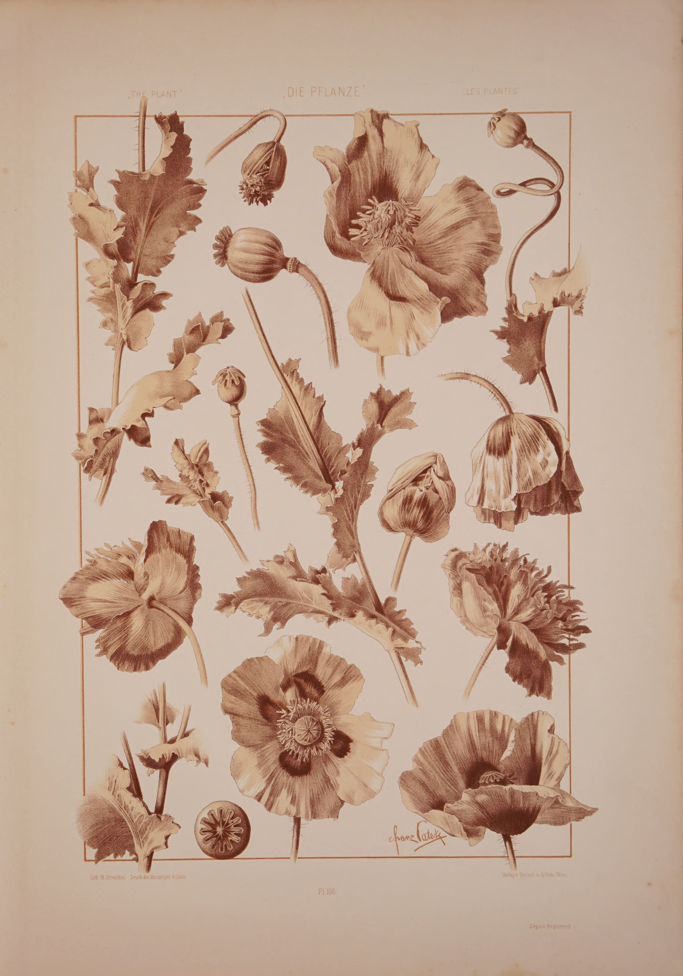 A lithograph of a garden poppy in various states of bloom and poppy seed heads.