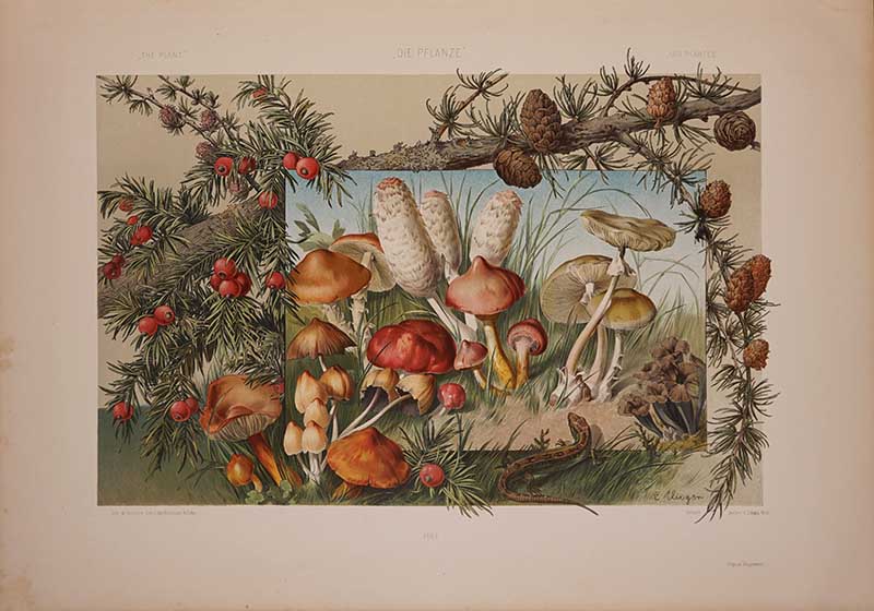 Ornamental patterns made up of assorted mushrooms and pine cones.