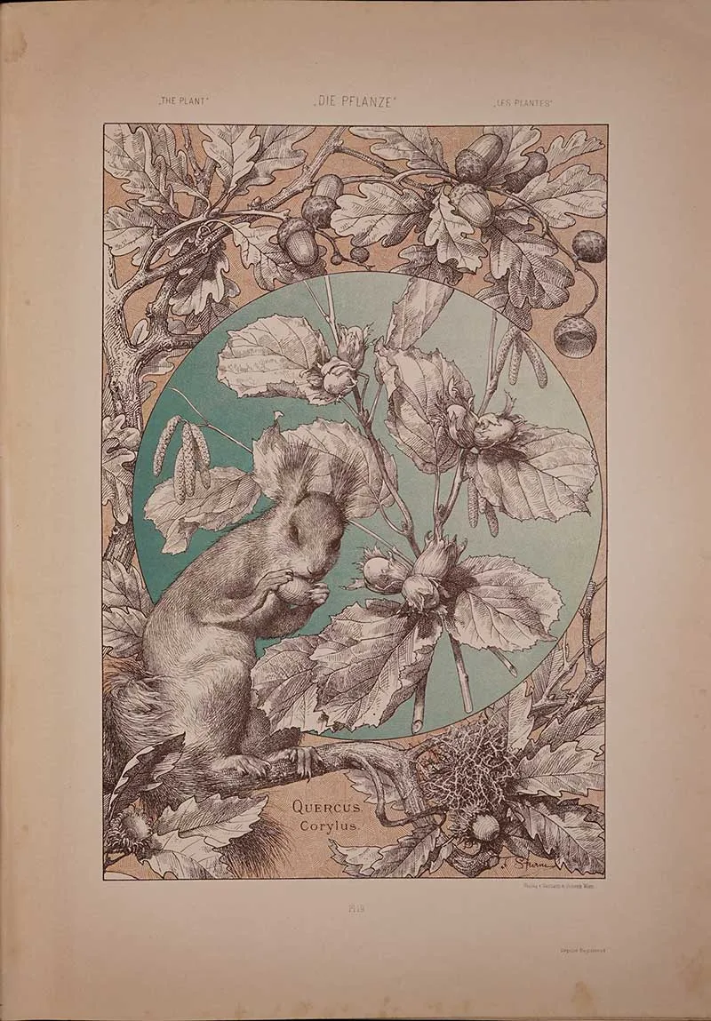 A photolithograph of a squirrel amongst oak leaves feasting on hazelnuts.