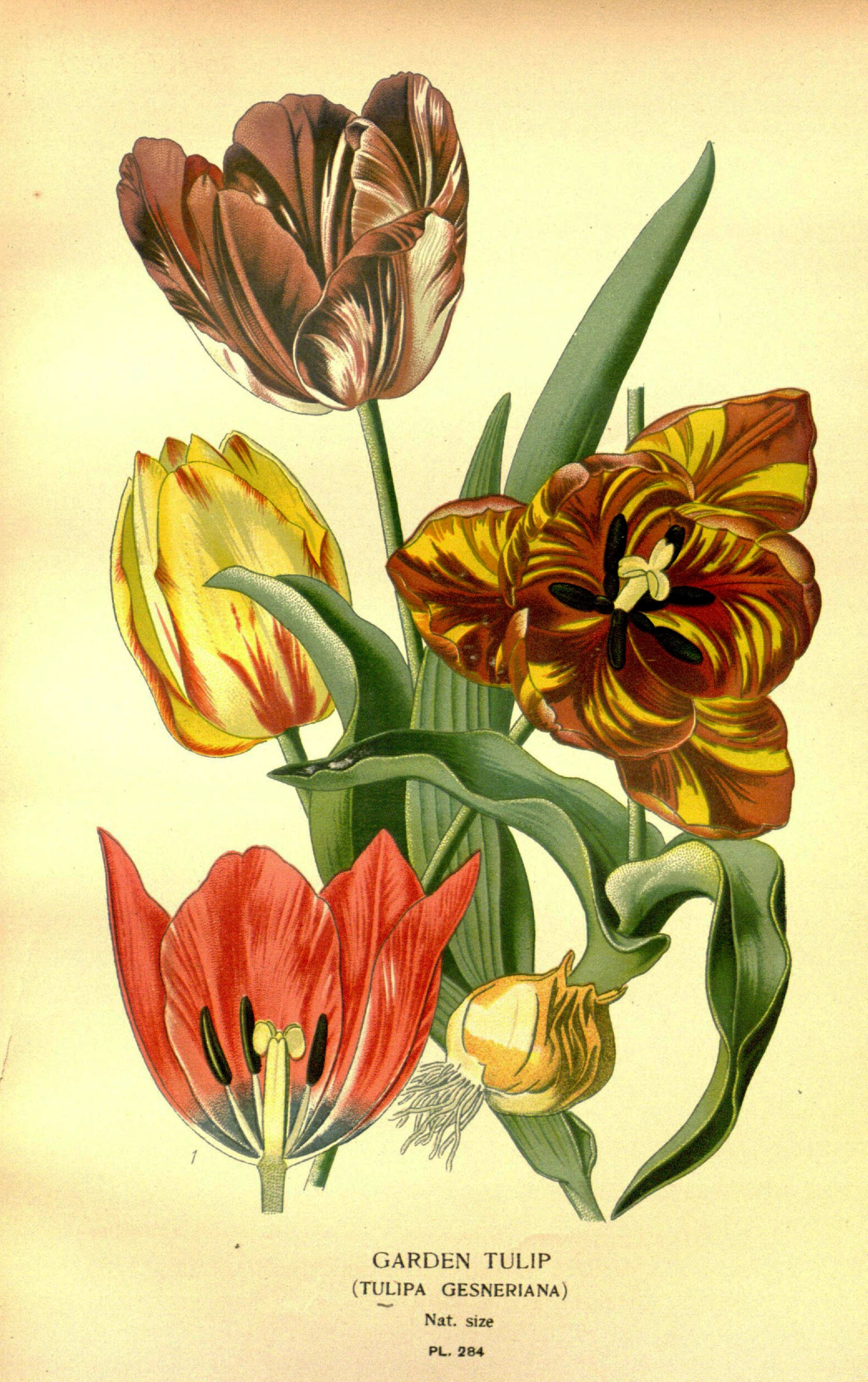 A collection of garden tulips, an illustration from the book “Favourite Flowers of Garden and Greenhouse” by Edward Step. Printed in 1896.