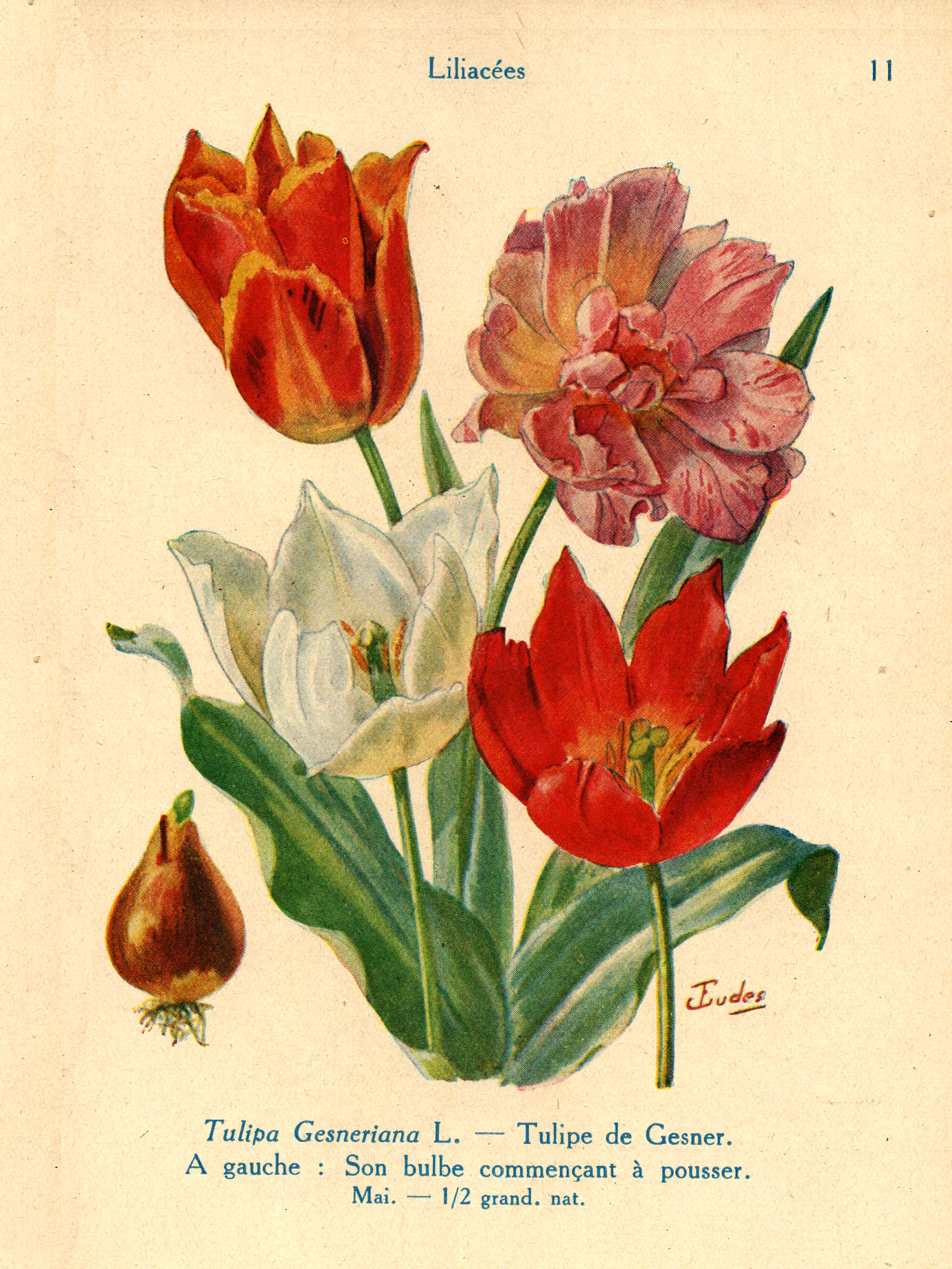 Colourful tulip paintings are from the French book “Les Fleurs de Jardins, tome I: Les Fleurs de Printemps”. The book was printed in 1829.
