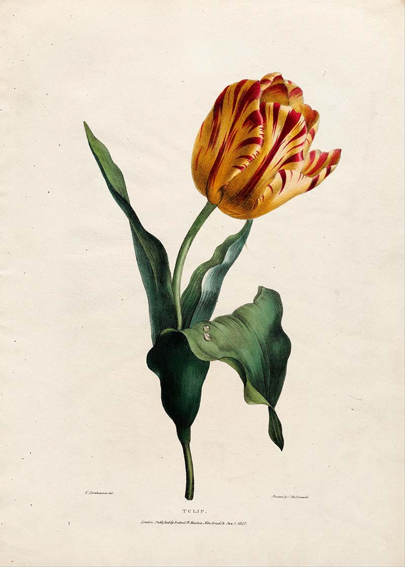 A gorgeous print of a group of tulips is in the famous book The Temple of Flora and several in Marshal’s Florilegium.
