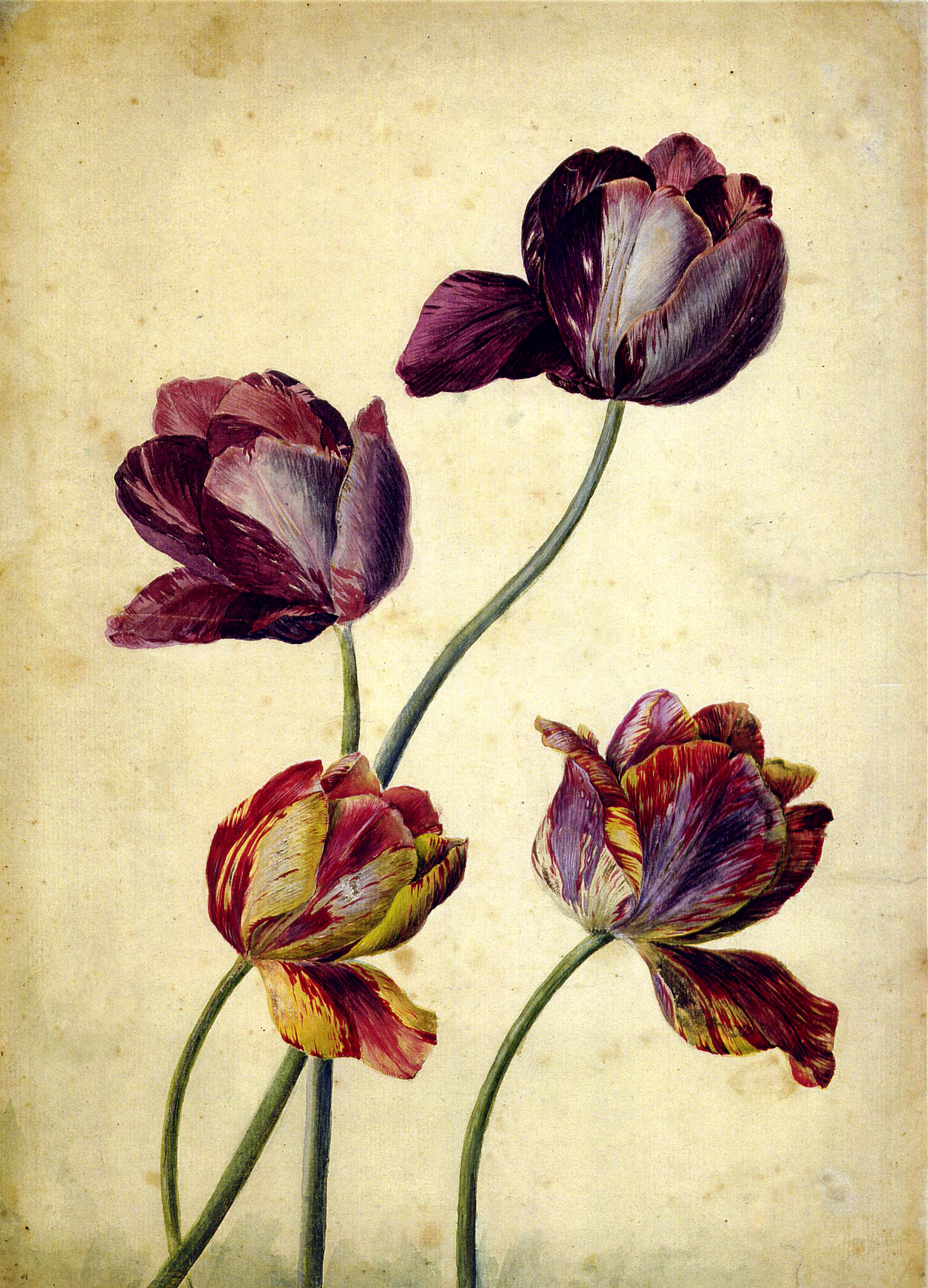 A lovely tulip illustration from the 1650s of four garden tulips (Tulipa gesneriana). Painted by the artist Hans-Simon Holtzbecker.