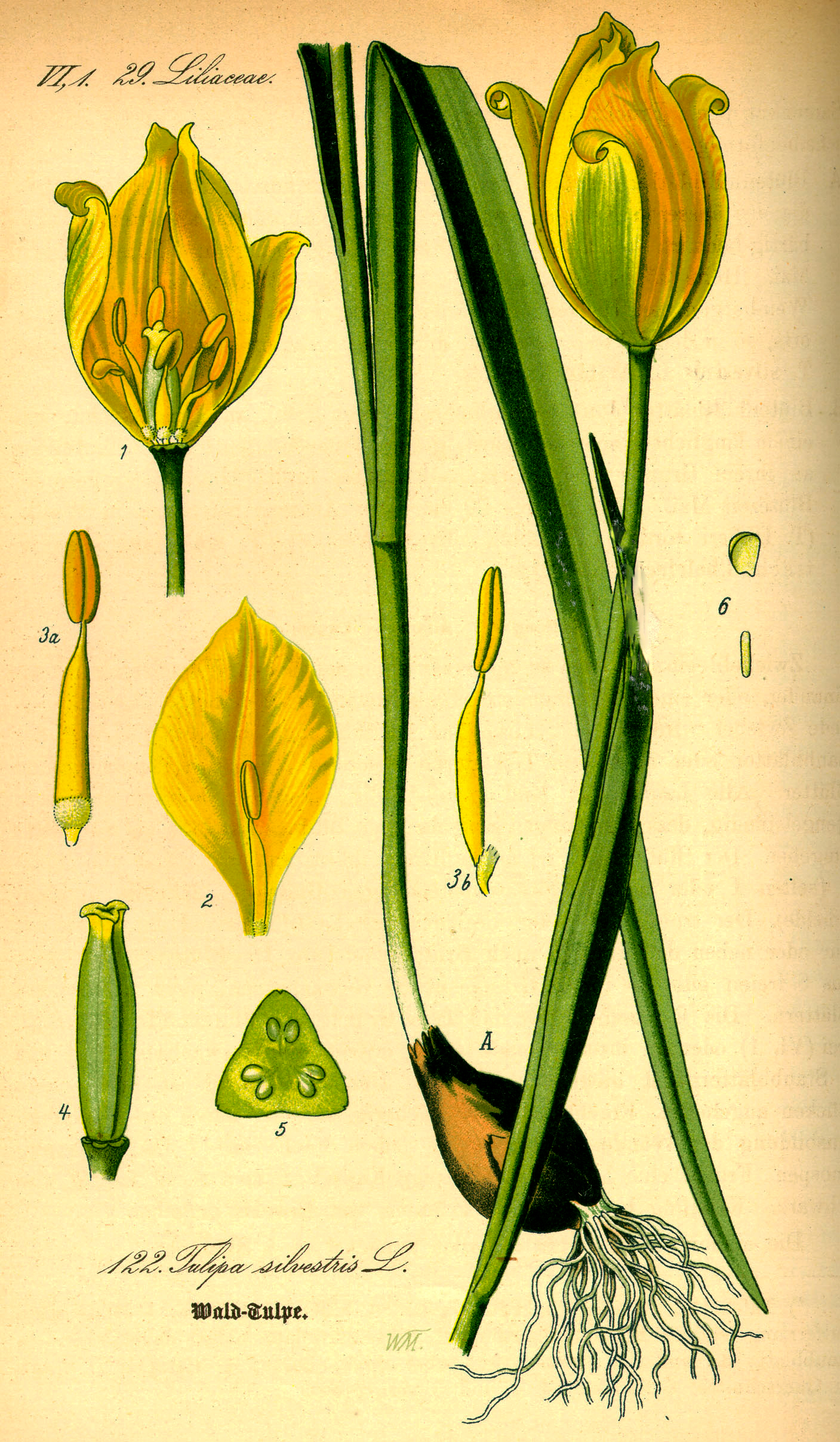 This particular tulip illustration is from the German flower book “Flora von Deutschland, Österreich und der Schweiz 1885″ by Otto Wilhelm Thomé.