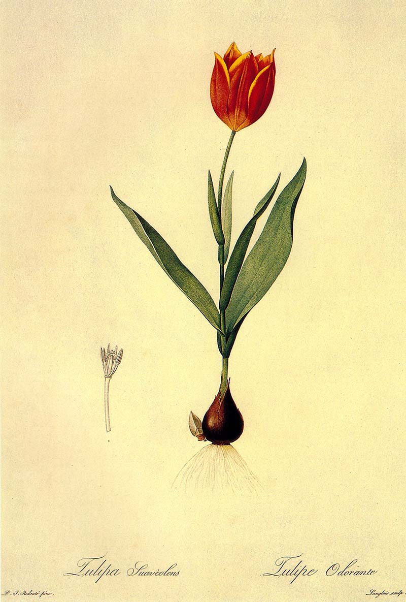 A tulip painting of a Tulipa suaveolens (or Schrenck’s tulip). The picture is by the famous French flower painter Pierre-Joseph Redouté. The illustration is from his book “Les Liliacées”.