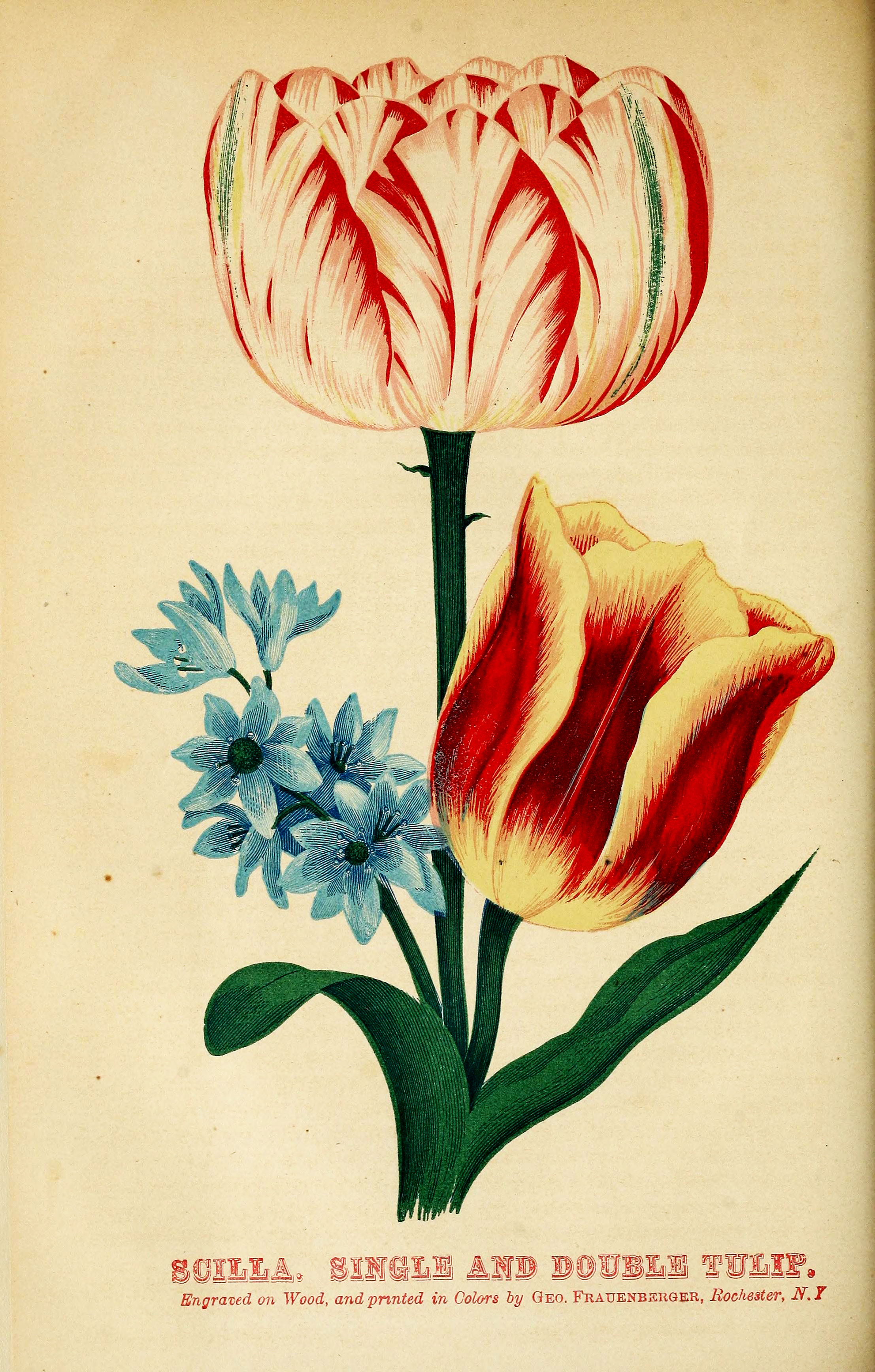 A double tulip is a tulip with extra petals. So in these tulip paintings, the large flower at the top of the page is the double tulip. This particular tulip illustration is from the “The California Horticulturist and Floral Magazine” (1870).