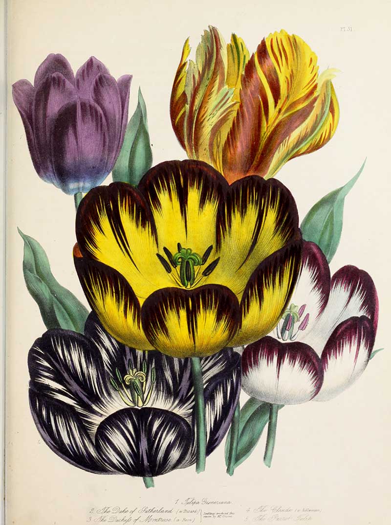 A collection of tulips from Jane Loudon’s book “The ladies’ flower-garden of bulbous ornamental plants”, 1841. You can find many more of Jane Loudon’s bulb flower prints here.
