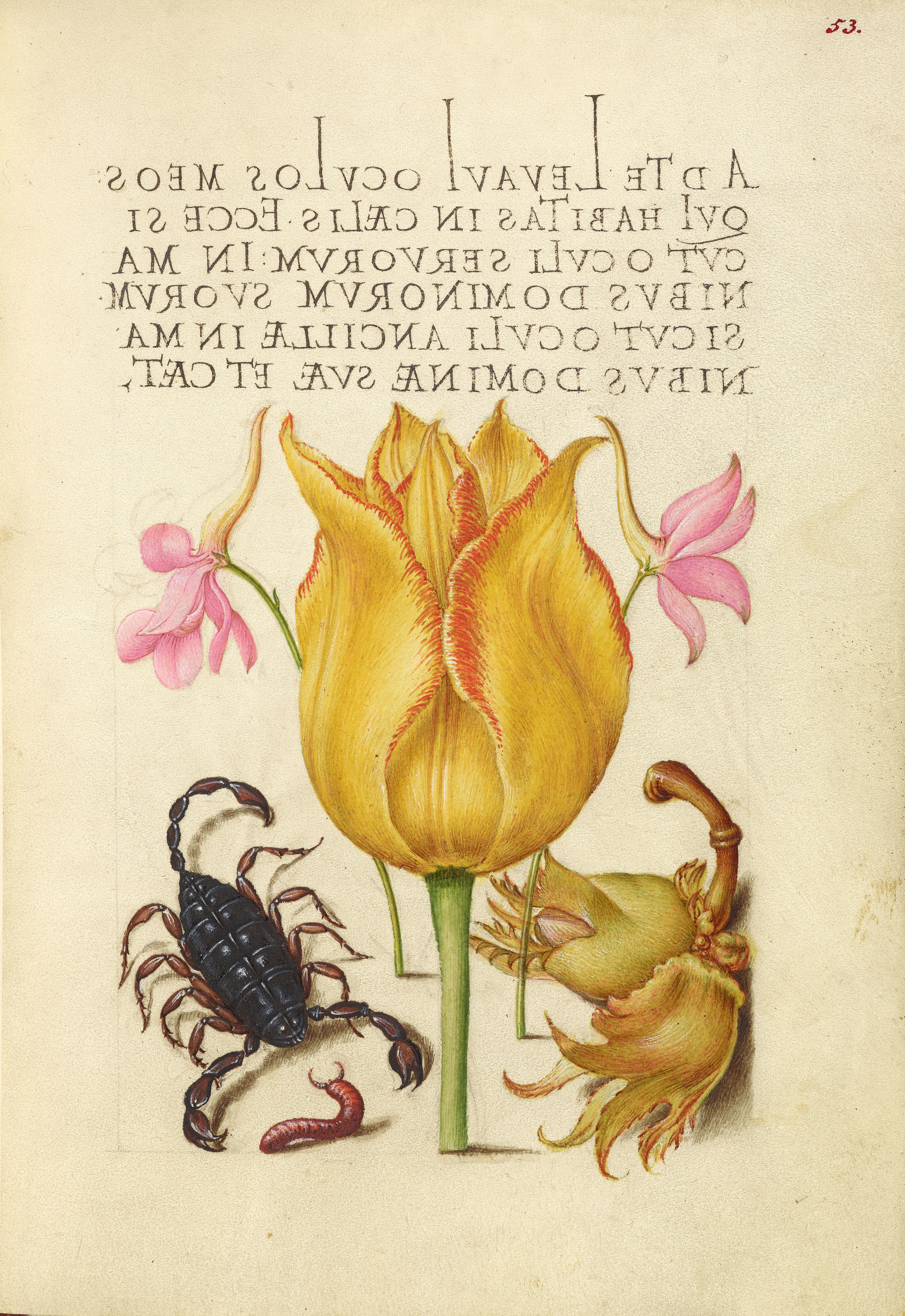 The tulip below was painted by Joris Hoefnagel to illustrate a page of calligraphy from the manuscript “Mira Calligraphiae Monumenta.“