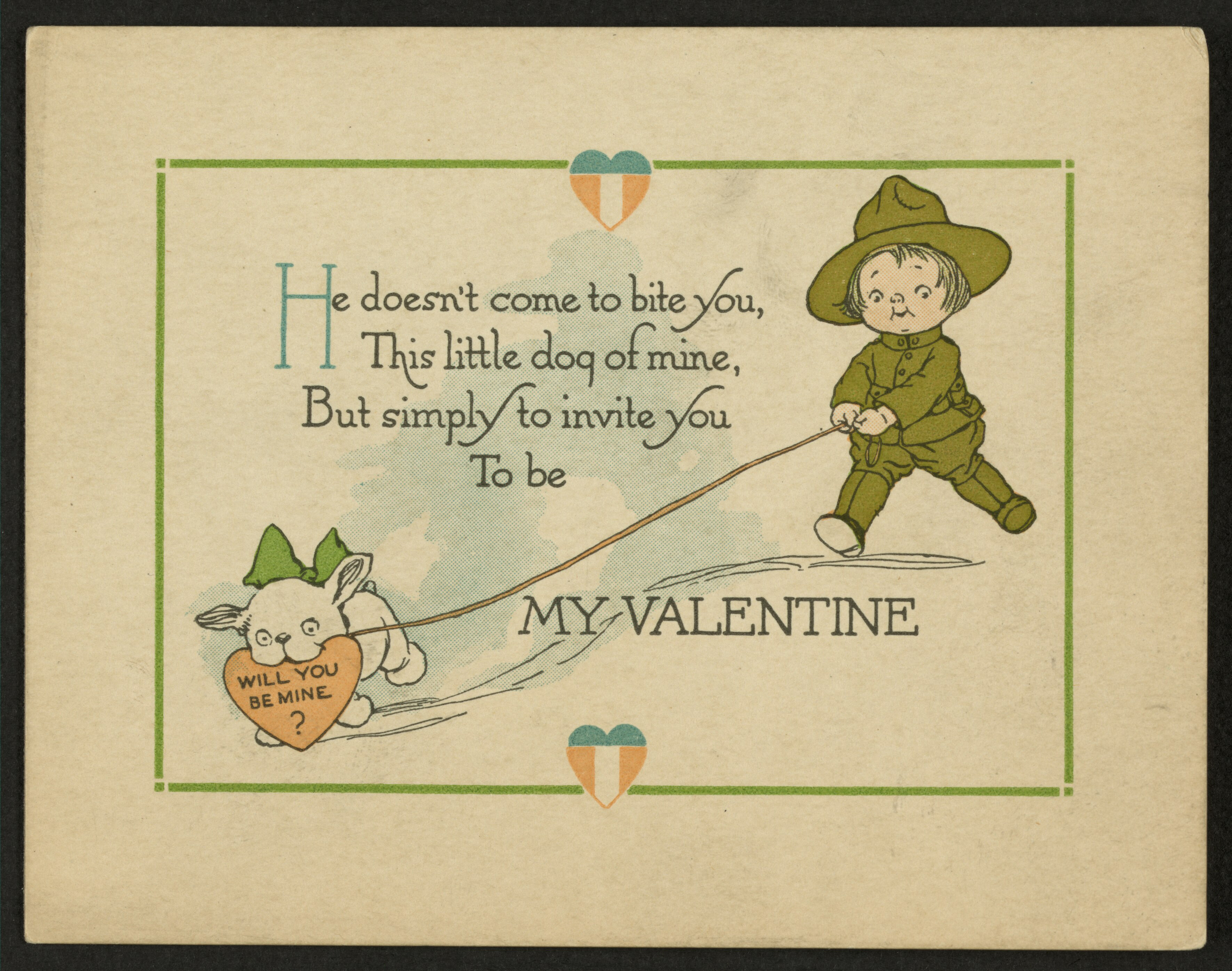 The card shows a little boy in a military uniform holding a leash with a dog that has a valentine in its mouth, “Will you be mine?” 1919.