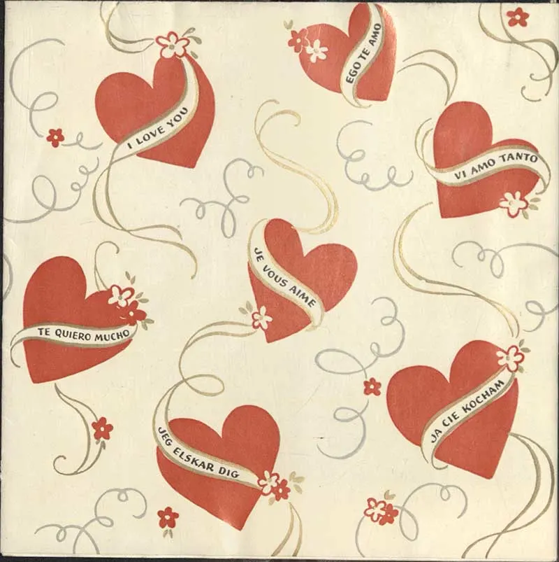 A free printable vintage Valentine’s Day of seven red hearts. All with “I Love You”, written in seven different languages.