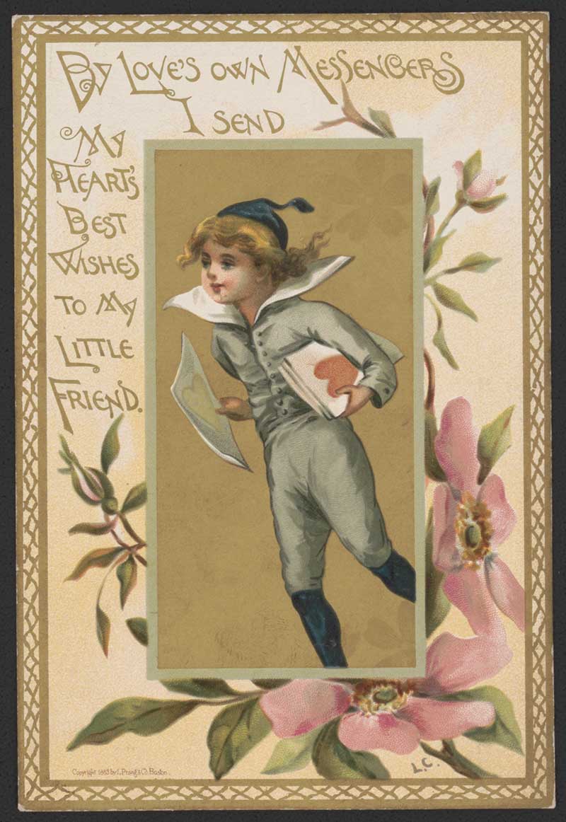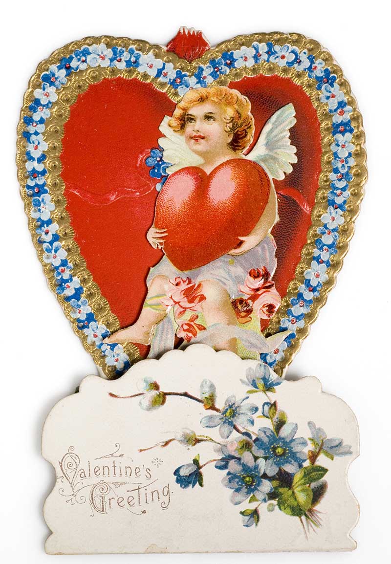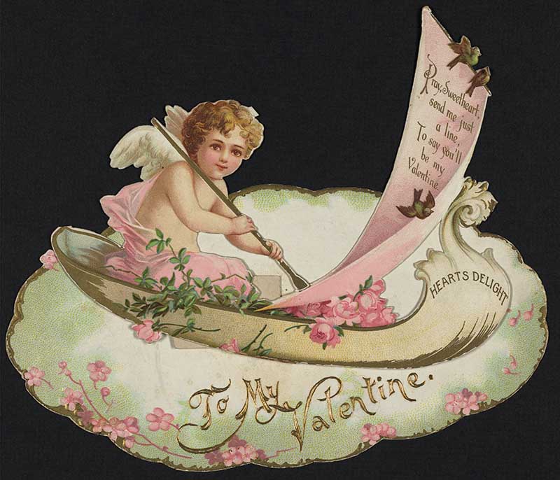 This vintage Valentine card from 1890 shows an angel paddling in a small boat called “Hearts Delight”; the sail has the inscription: “Pray, Sweetheart, send me just a line to say you’ll be my Valentine”.