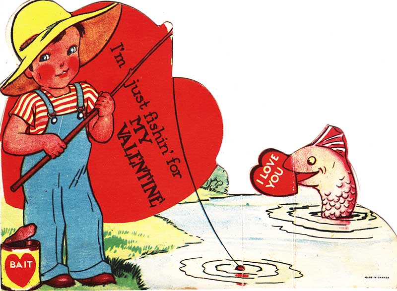 A 1940s card from Canada, “I’m Just fishin’ for my Valentine”.