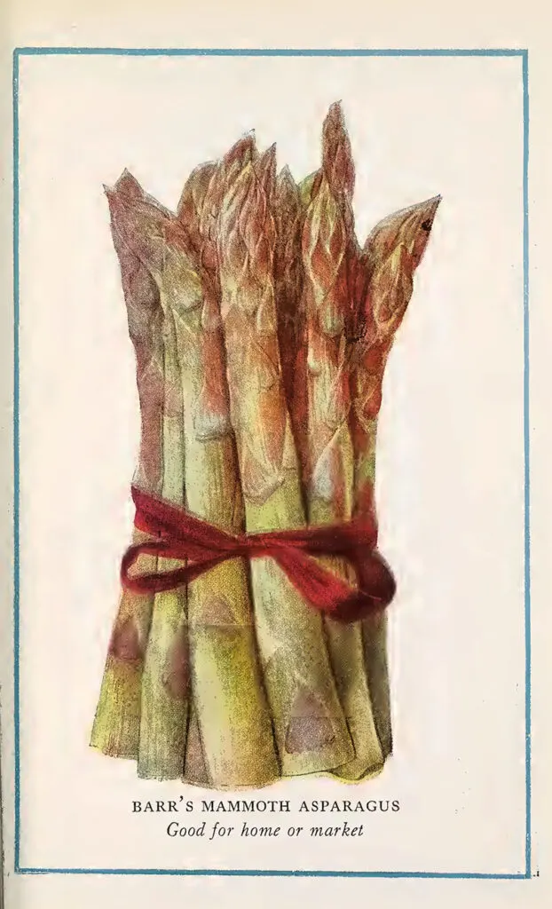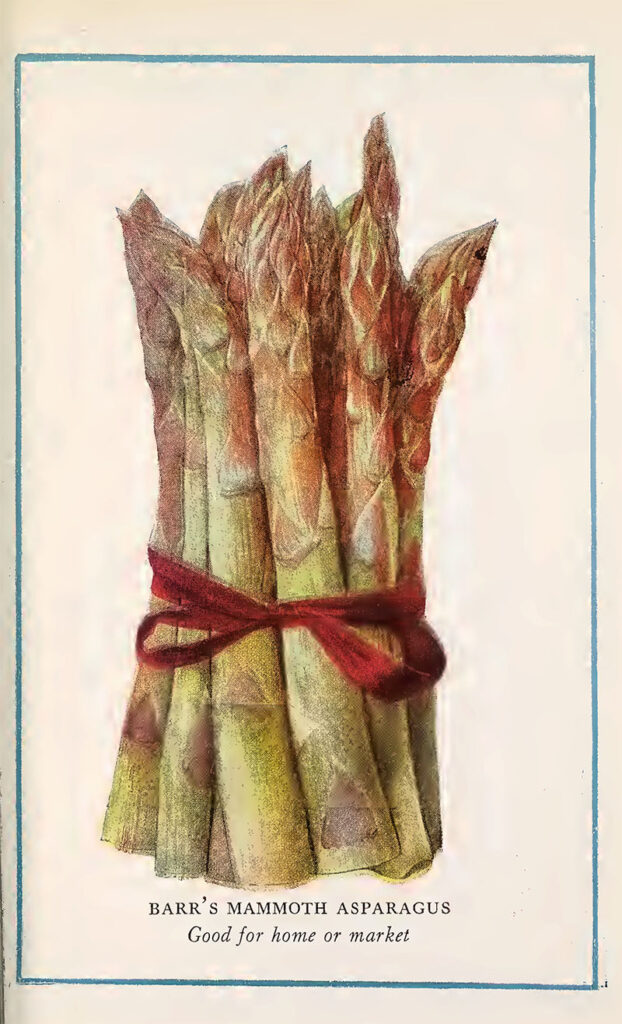 ” A delicious vegetable, yielding one of the best spring, delicacies year after year, providing it is properly cultivated and cared for. Equally easy to grow from either seeds or roots, but time is saved by starting the asparagus bed with two-year-old roots.”