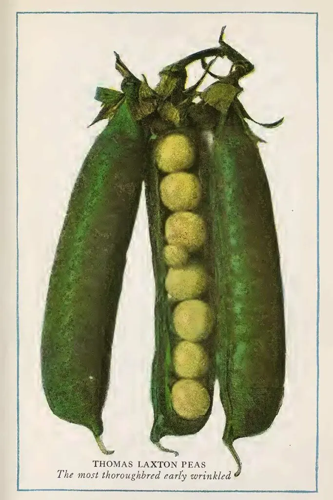 “As one of the hardiest and most easily grown vegetables, these deserve a place in every home garden. Particularly in view of the fact that real quality peas can never be bought on market. However, it does not pay to grow them in very small gardens. Because considerable space must be planted to them so as to enable one to gather pods sufficient for a meal at one picking.