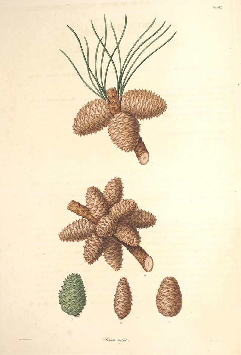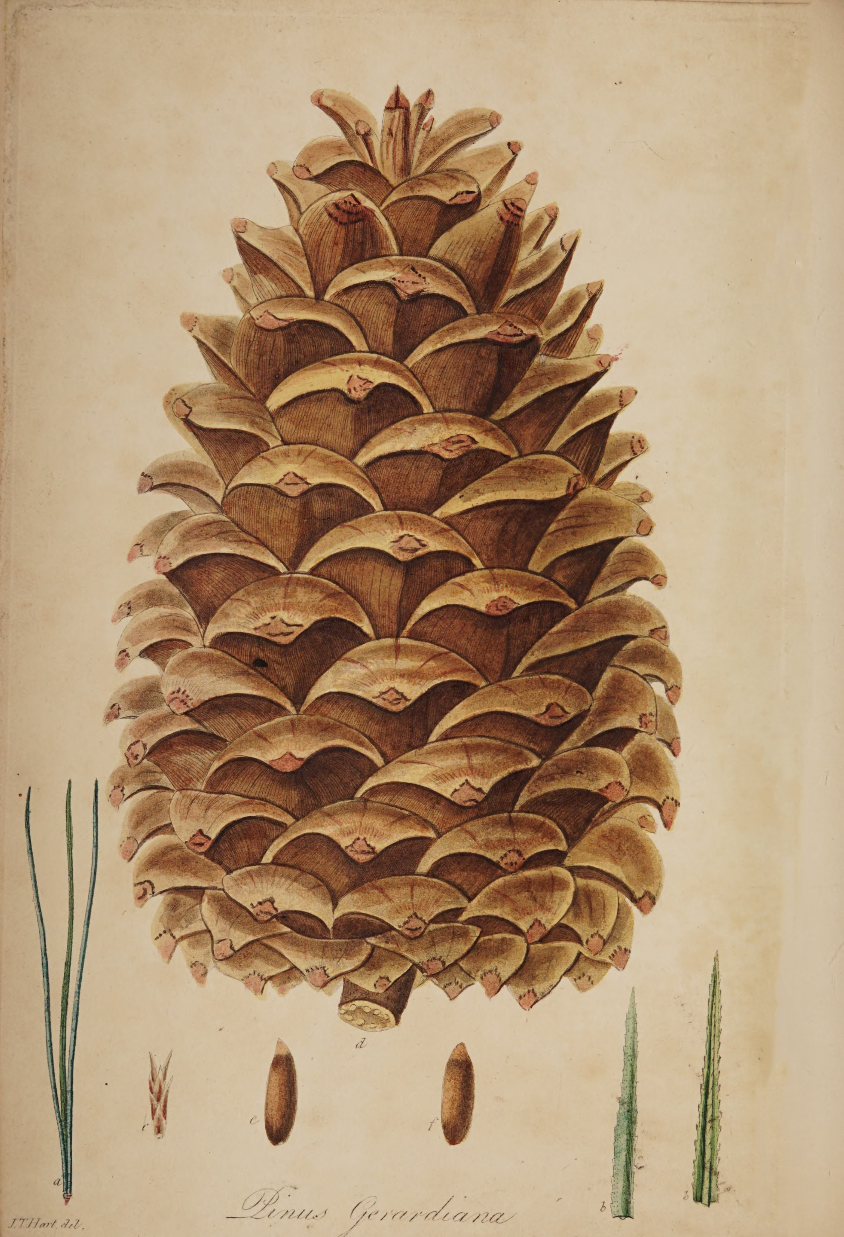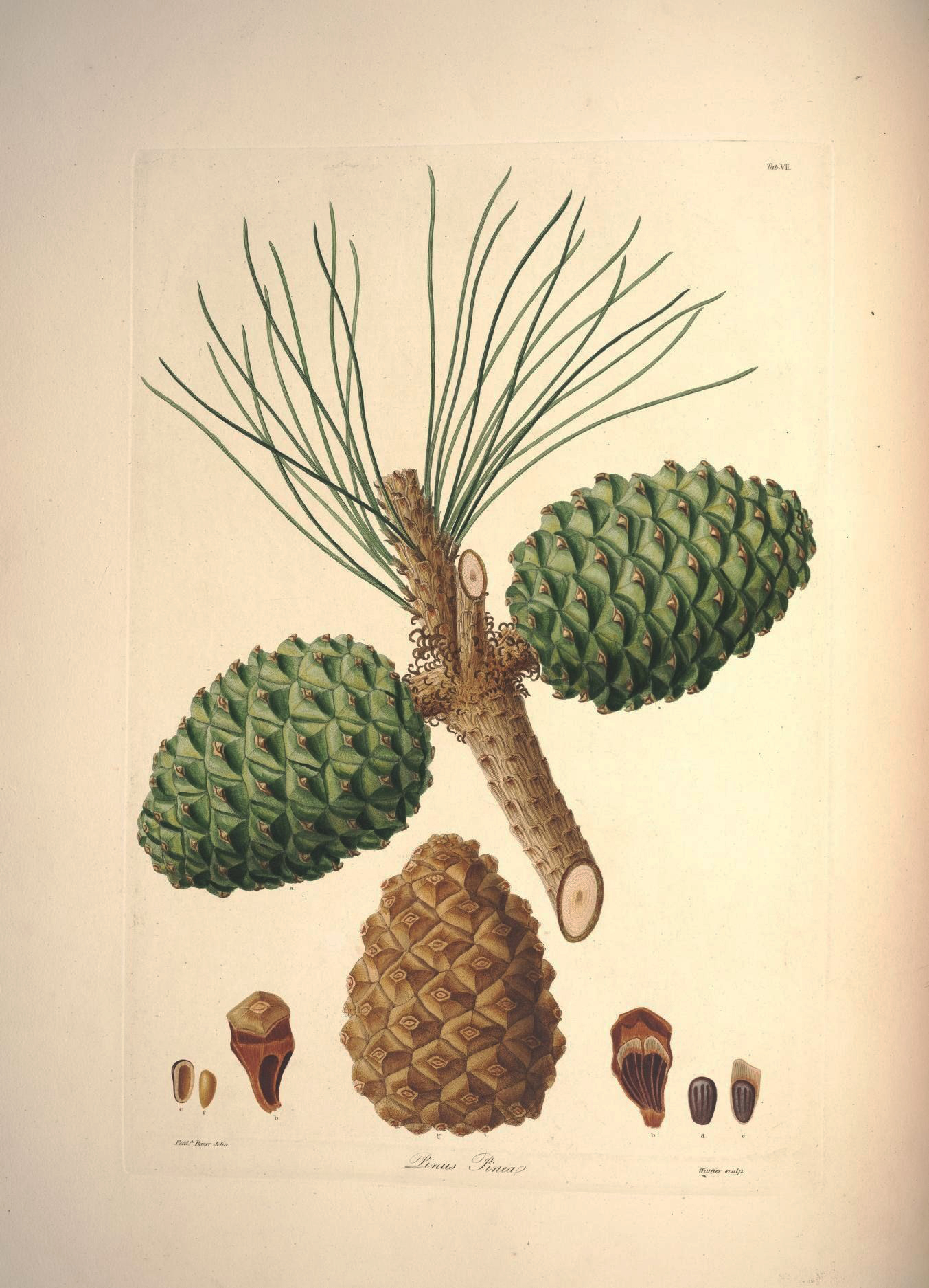 Some of the striking evergreen prints in this roundup come from A Description of the Genus Pinus by Aylmer Bourke Lambert (1824). A true conifer enthusiast of the early 1800s! This beautifully illustrated book dives deep into the world of pines and their cone-bearing cousins, with detailed descriptions, cultivation tips, and notes on how each species was used.