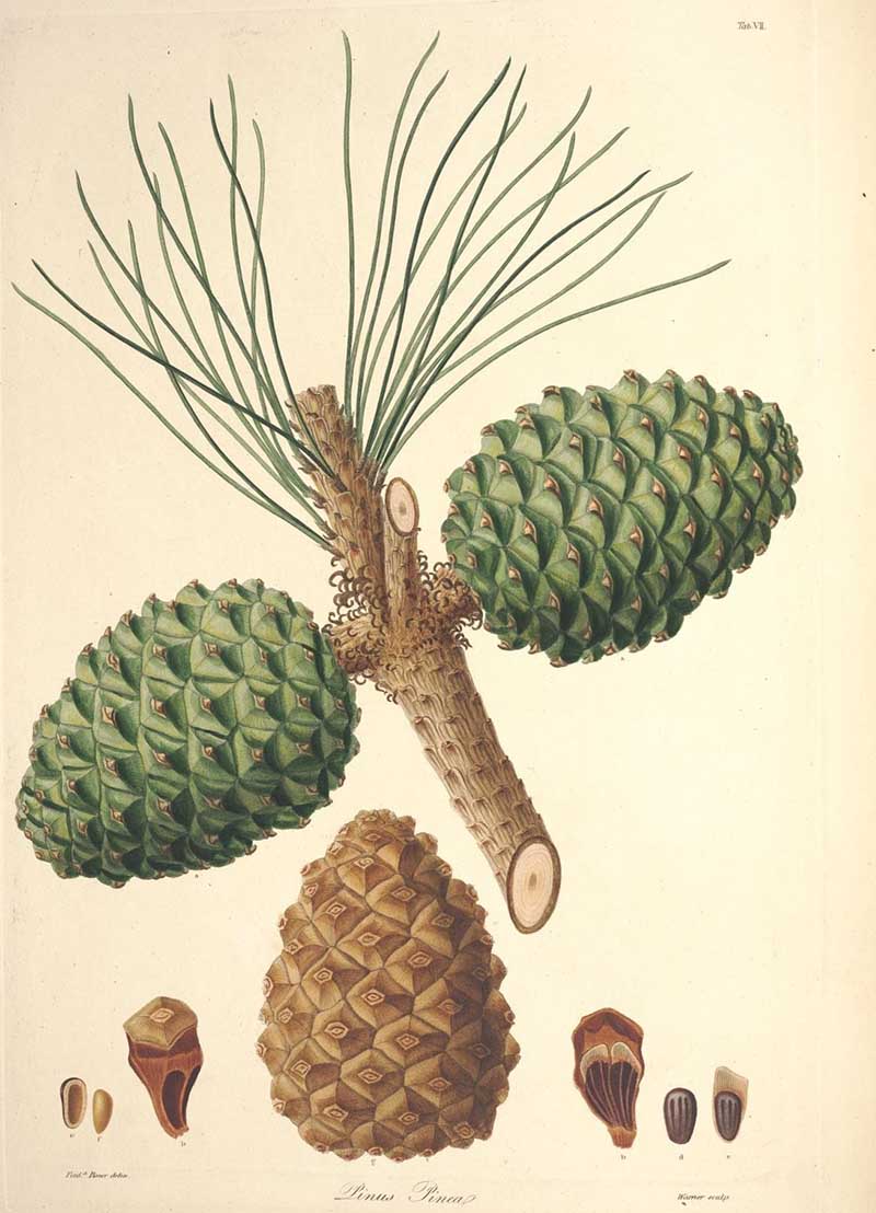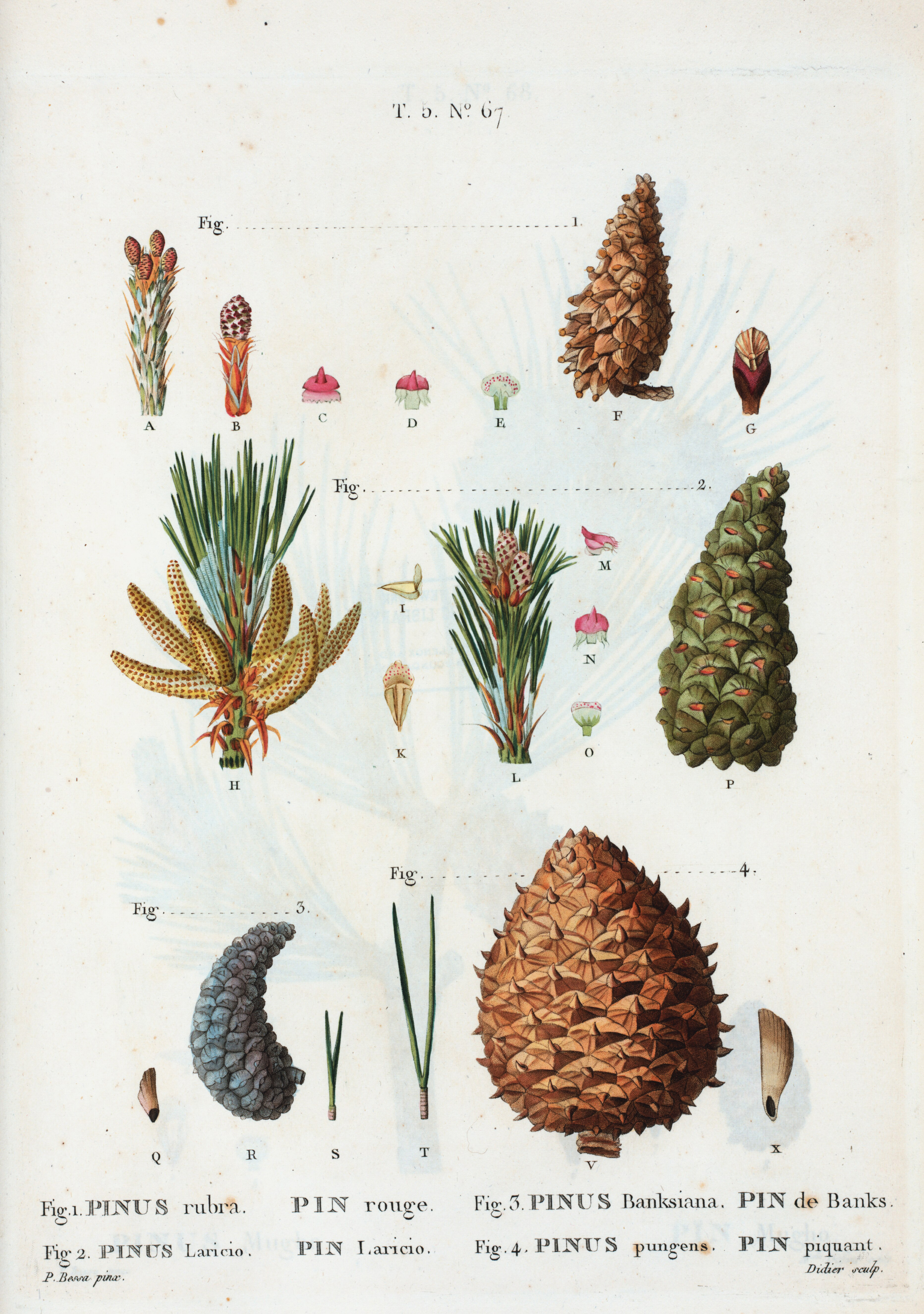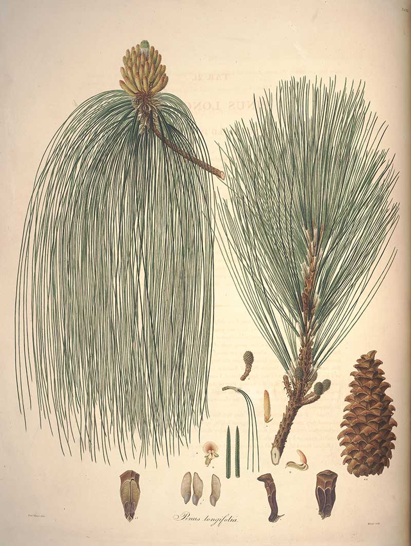 Some of the striking evergreen prints in this roundup come from A Description of the Genus Pinus by Aylmer Bourke Lambert (1824). A true conifer enthusiast of the early 1800s! This beautifully illustrated book dives deep into the world of pines and their cone-bearing cousins, with detailed descriptions, cultivation tips, and notes on how each species was used.
