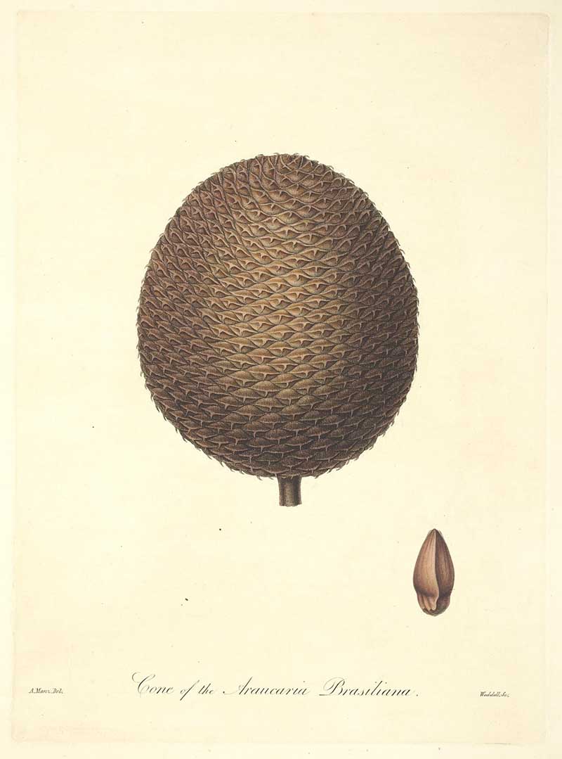 The cone of the Brazilian Pine is large and rounded, packed with edible seeds known as pinhões—a favourite seasonal treat in southern Brazil and a key feature that adds to the tree’s unique, almost prehistoric appearance.
