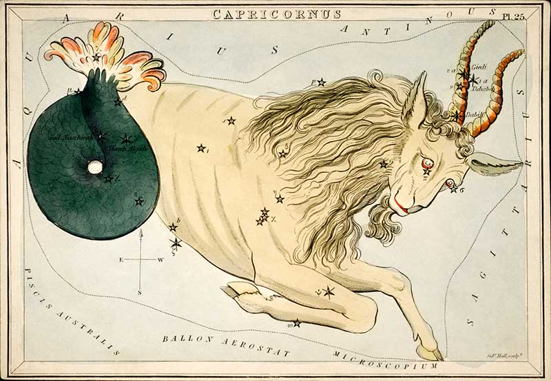Under the tropical zodiac, the sun transits Capricorn from about December 21 to January 21. Capricorn is an earth sign and a kind of sea-goat. Its symbol is based on the Sumerians’ god of wisdom and waters, Enki, with the head and upper body of a goat and the lower body and tail of a fish.