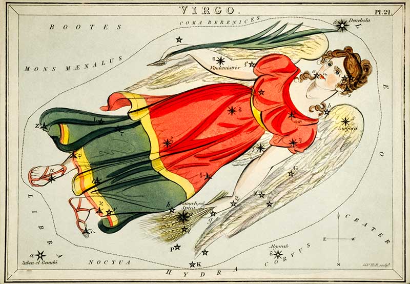 The Sun transits Virgo on average between August 23 and September 22. Virgo is an earth sign and, in Greek mythology, is represented by Astraea. She was the last immortal to abandon Earth at the end of the Silver Age when the gods fled to Olympus.